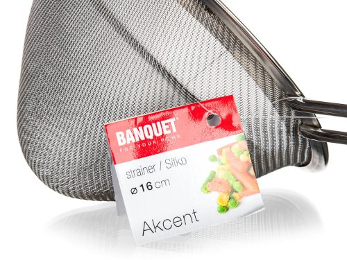Sítko 16 cm, kónické, AKCENT, nerez. průměr: 16 cm materiál: nerez Nerezové kónické sítko AKCENT je vhodné na cezení nejrůznějších tekutin a nápojů.