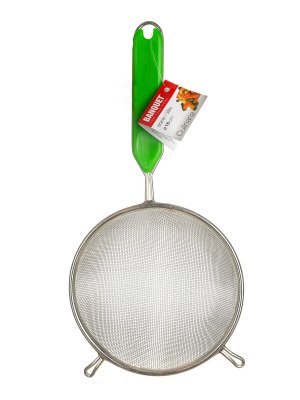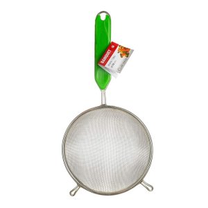 průměr: 16 cm materiál: pocínovaný kov, držadlo s plastovou vložkou ABS hustota mřížky: 1 x 1 mm počet oček: 15 na cm2