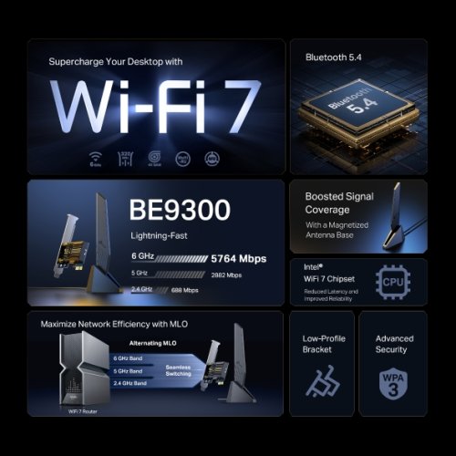 Karta Archer TBE553E využívá Multi-Link Operation pro paralelní komunikaci na více pásmech a vyšší efektivitu sítě. WiFi 7 umožňuje širší kanály, vyšší modulaci 4K-QAM a minimální zpoždění, což představuje ideální volbu pro hraní, stream nebo práci z domova.