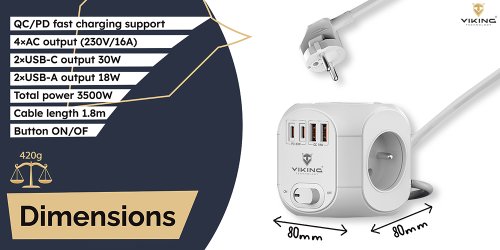 Technické specifikace: •Model: Síťový adaptér Viking AC CUBE PD30 •Jmenovitý výkon: 230V, 16A, 50/60Hz, 3500W MAX •2x USB-A výstup: (QC 18W) 5V/3A, 9V/2A, 12V/1.5A •2x USB-C výstup: (PD 30W) 5V/3A, 9V/3A, 12V/2,5A, 15V/2A, 20V/1,5A •USB-A výstup+USB-C výstup: 5V/3A (Total) •4x AC výstup 230V, 16A, 50/60Hz, 3500W MAX •1x AC vstup 230V, 16A, 50/60Hz, 3500W MAX •Počet výstupů (8x): 2x USB-A výstup + 2x USB-C výstup + 4x AC výstup •Hmotnost: 420g •Rozměry: 8 x 8 x 8 cm •Délka kabelu: 1,8 m