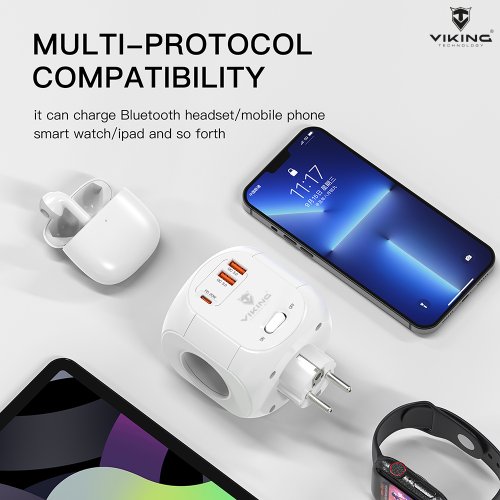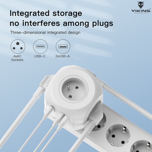 Klíčové vlastnosti: •Čtyři AC výstupy: S maximálním výkonem 3500W a podporou až 16A je adaptér připraven zvládnout náročná zařízení, jako jsou počítače, monitory, tiskárny a další domácí elektroniku. •Rychlé USB nabíjení: Dva USB-A a jeden USB-C port vám umožní nabíjet mobilní telefony, tablety a další elektroniku vysokou rychlostí. USB-A porty nabízejí výkon až 12V/1,5A, zatímco USB-C port podporuje napětí až 12V/1,67A. •Kompaktní a lehký design: Díky svým malým rozměrům (8 x 8 x 8,1 cm) a hmotnosti pouze 296 gramů je Viking AC43 snadno přenosný a nezabírá mnoho místa na pracovním stole nebo doma. •Bezpečné ovládání: Hlavní vypínač ON/OFF umožňuje snadné a rychlé odpojení všech zařízení najednou, což je praktické pro šetření energie a prevenci přepětí.