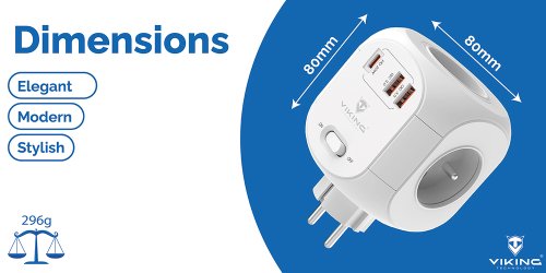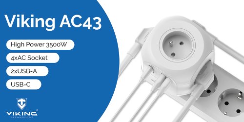 Technické specifikace: Model: Síťový adaptér Viking AC43 AC 230V vstup: 230V, 16A, 50Hz, 3500W max. AC 230V výstup (4x): 230V, 16A, 50Hz, 3500W max. USB-A výstup (2x): 5V/3A, 9V/2A, 12V/1,5A USB-C výstup (1x): 5V/3A, 9V/2,22A, 12V/1,67A USB-A + USB-C výstup: 5V/3A Hmotnost: 296 g Rozměry: 8 x 8 x 8,1 cm