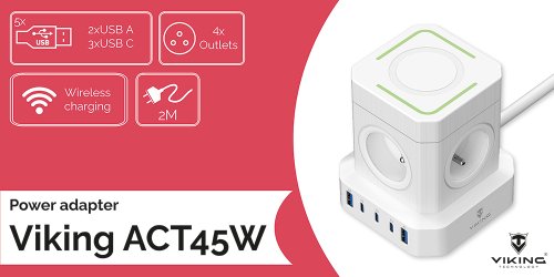 Viking ACT45W kombinuje pět výkonných USB portů (3× USB-C a 2x USB-A), čtyři AC zásuvky a 2m prodlužovací kabel v jednom kompaktním zařízení, které umožňuje současné napájení až 10 zařízení.