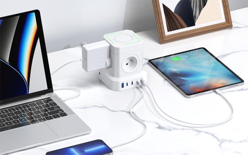 Síťový adaptér • zásuvka • rozbočovač • 4 × AC výstup (220V-250V/16A) • 2 × USB-A 18W (5V/3A,9V/2A,12V/1,5A) • 3 × USB-C 100W (5V/3A,9V/3A,12V/3A,15V/3A,20V/5A) • celkový výkon 4000W • podpora kombinovaného nabíjení více zařízení • bezdrátové nabíjení 15W • odolné materiály a bezpečnostní prvky • délka kabelu 2m • kompaktní a robustní design • možnost nabíjení až 10 zařízení současně