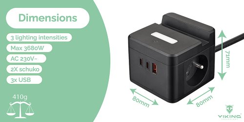 Technické specifikace: Model: Viking YC23H AC 230V vstup: 230V, 16A, 50Hz, 3680W max. AC 230V výstup (2x): 230V, 16A, 50Hz, 3680W max. DC USB-A výstup (1x): 5V/3A, 9V/2A, 12V/1,5A DC USB-C výstup (2x): 5V/3A, 9V/2,22A, 12V/1,67A Hmotnost: 410 g Rozměry: 8 x 8 x 7,1 cm Kabel: H05VV-F, 3G1,5mm2 Délka kabelu: 1,3m Světlo: 3 intenzity svícení, dotykové ovládání