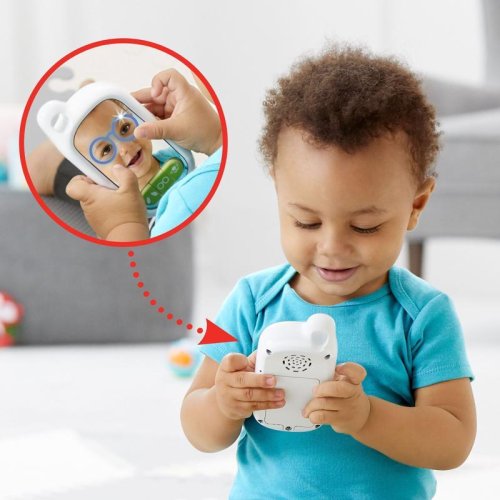 První selfie! Díky svému zrcadlovému povrchu tento roztomilý telefon povzbuzuje děťátko při sebepoznávání během hry.