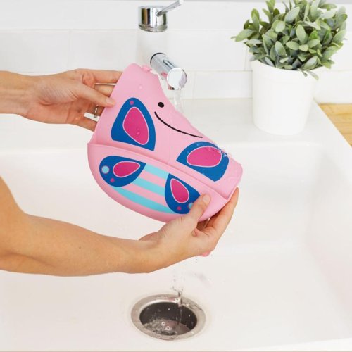 Silikonový bryndák Skip Hop z kolekce Zoo ve tvaru zvířátka. Bryndák zachytí padající jídlo od nezbedných jedlíků.