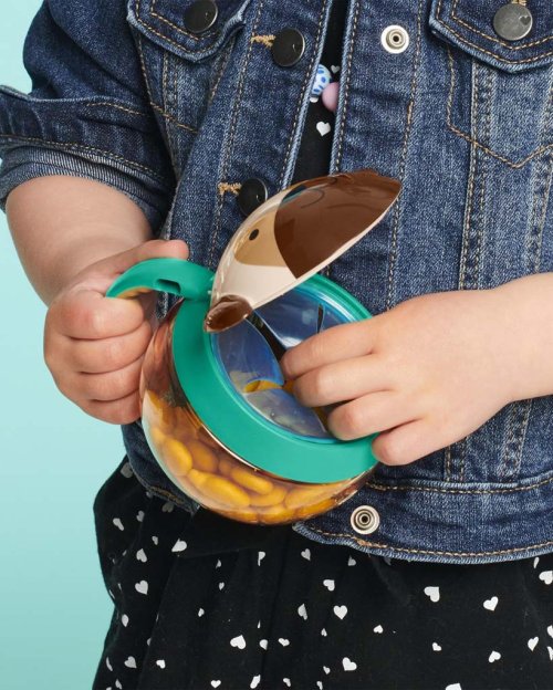 Chytrý nápad na cesty. Kalíšek má víčko, které po otevření drží, před vysypáním obsahu jej chrání pružné lamely, které pustí dětskou ručičku dovnitř, ale nepustí svačinku ven.