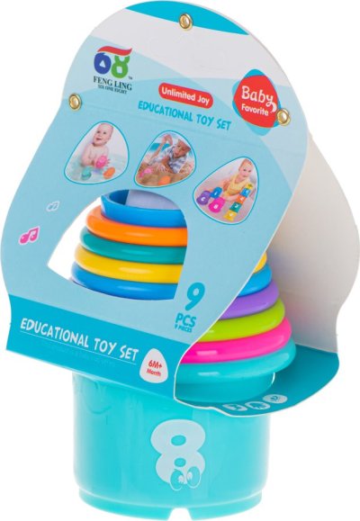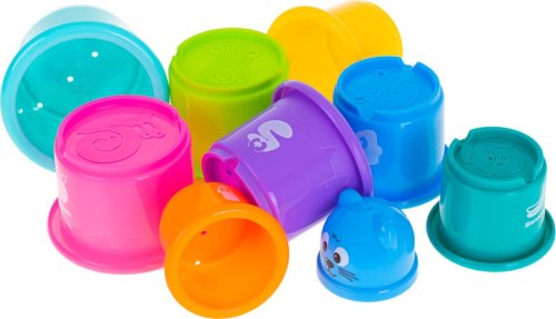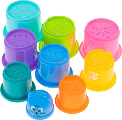 Skládáním se dítě zabaví a bude trénovat manuální dovednosti - rozvíjí přesnost prstů a koordinaci oko-ruka. Podporuje kreativitu a logické myšlení. Kelímky jsou očíslovány od 1 do 8 a z druhé strany jsou různé druhy ovoce s anglickými nápisy. Každý kelímek má také zespod vyražená zvířátka. S kelímky si lze hrát doma, ve vaně, na pískovišti či na pláži. Balení obsahuje 9 kelímků.