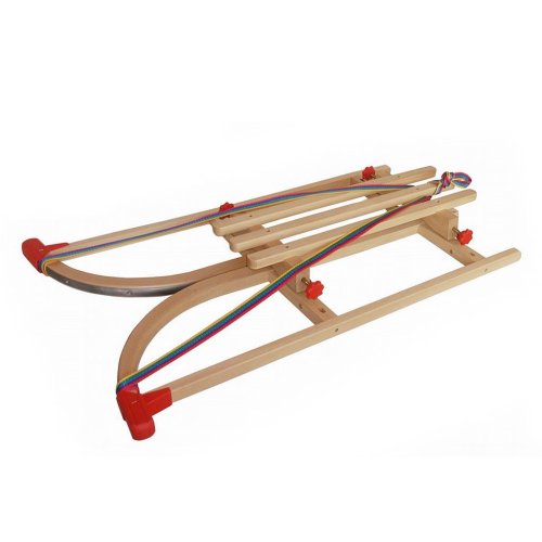 Pevné a odolné dřevěné skládací sáňky se zesílenou konstrukcí jsou vyrobeny z bukového dřeva a pokryty bezbarvým transparentním lakem, díky němuž si dřevo zachovává svou stálou barvu a strukturu. Díky patentovanému systému rychlého a bezpečného skládání zabírají sáňky ve složeném stavu velmi málo místa (na výšku pouhých 9 cm). Nerezové ližiny zvyšují jejich odolnost a pohodlí během jízdy. Přední část saní je chráněna speciálními ochrannými kryty. Jsou vybaveny tažnou šňůrou. Vyznačují se vysokou trvanlivostí a odolností proti poškození.