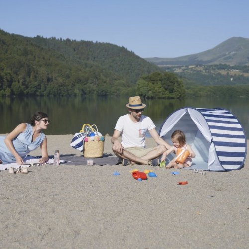 Stan se snadno sestavuje a skládá díky pop-up systému, je dostatečně velký i pro 2 děti. Má velký otvor vpředu a dvě ventilační okénka vzadu pro optimální cirkulaci vzduchu. Síťkou v přední části lze celý stan uzavřít, čímž vytvoříte ochranu před hmyzem během léta. Dno stanu je nepropustné. Tento plážový stan je dodáván se 4 kolíky pro upevnění. Stan je velmi lehký (<1 kg) a snadno se přenáší v tašce s poutky, která je součástí.