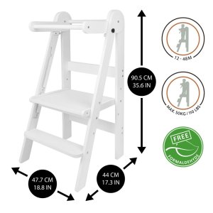 Tato vzdělávací věž LOFTY je vyrobena z vysoce kvalitní překližky a je určena pro děti ve věku 18–48 měsíců. Maximální nosnost až 50 kg. Rozměry výrobku: 47,7 (Š) x 44 (H) x 90,5 (V) cm. NASTAVENÍ VÝŠKY: Výška plošiny je možná ve 3 polohách, aby vyhovovala výšce dítěte: 29,4, 36,9, 44,4 cm (měřeno od podlahy). JEDNODUCHÉ: Dítě může na vzdělávací věž vylézt samostatně, schůdek ve výšce 16 cm od podlahy, což dítěti pomáhá bezpečně nastoupit na výrobek. VŠESTRANNÉ: Výška věže je navržena tak, aby se vešla na většinu kuchyňských desek nebo do koupelny. umyvadla. SKLADACÍ: Tato věž je skládací, snadno se přenáší z kuchyně do koupelny a šetří místo při skladování. BEZPEČNÉ: Dřevěný materiál byl testován a potvrzeno, že neobsahuje formaldehyd.