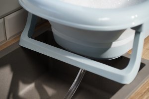 Vanička je vybavena výpustním ventilem a páskovým teploměrem, což výrazně zvyšuje komfort a bezpečnost při každodenním používání. Dá jednoduše složit na výšku pouhých 10 cm, přičemž plastové nožičky se sklopí přímo pod vaničku – díky čemuž zabírá minimum místa a je ideální pro skladování i v menších prostorách.
