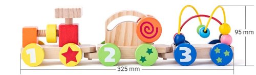 Vláček pro nejmenší nabízí dětem hned několik prvků k procvičení jemné motoriky: šroub na lokomotivě, korálky na drátěné konstrukci, pohyblivé kolečko. Obsahuje: 3 dílky. Rozměr: 32,5 x 9 cm. Rozměr balení: 35 x 7,5 x 9 cm. Věk: 18m+