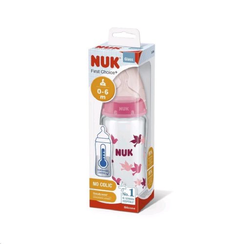 Skleněná kojenecká láhev NUK First Choice se širokým hrdlem s obrázkem. Zabudovaný indikátor kontroly teploty změní barvu, pokud je obsah lahvičky příliš horký. Modrá barva indikátoru se změní na bílou. Speciální tvar typický pro savičky NUK s ortodontickou antikolikovou savičkou je modelován podle mateřské bradavky při kojení. Ponechává dostatek prostoru pro přirozené sací pohyby jazyka i čelisti. Vylepšený systém proti polykání vzduchu při pití Anti Colic Air System zajišťuje přirozený tok mléka, aby dítě pilo uvolněně bez polykání vzduchu. Díky zvlášť přirozenému tvaru savičky Nuk o velikosti 1 je velmi dobře snášen kojenci. Vyrobena z vysoce kvalitního borosilikátového skla, které je zvláště odolné. Obsah láhve 240 ml. Vhodná pro děti od 0-6 měsíců. Klinicky testováno. Neobsahuje BPA. Kompatibilní se všemi NUK First Choice produkty.