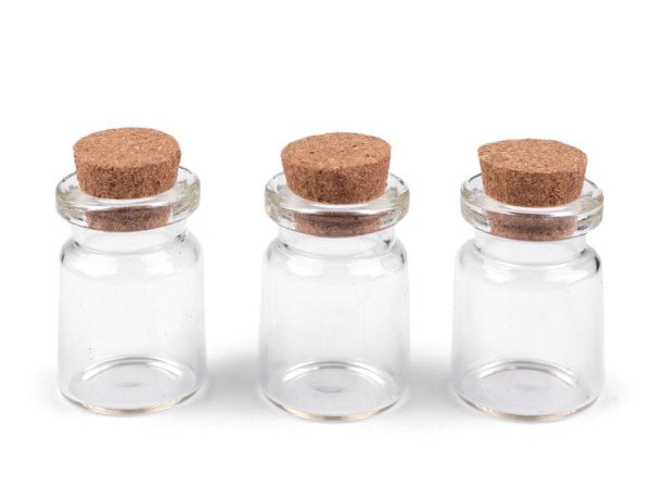 Skleněná lahvička s korkovým uzávěrem se dá využít ke skladování drobných předmětů jako jsou perličky, glitry, flitry apod. Můžete ji použít i jako přívěsek na krk. Lahvičku můžete dekorovat např. jemným barevným pískem, různými úlomky minerálů, kamínky, rostlinkami atd. nebo do ní lze vložit třeba i malý dopis. Jako šňůrku můžete použít kůži, která na přívěsku pěkně vynikne, řetízek či lanko. Vnitřní průměr otvoru lahvičky je 12 mm, vnější 20 mm. Výška samotného skla bez dřeva je 30 mm. Obsah lahvičky po hrdlo je 5 ml (může se uzavřít), celá naplněná lahvička až po okraj pojme 6 ml.