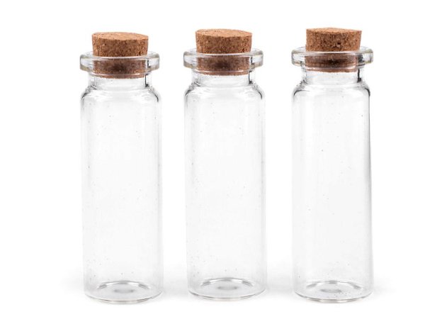 Praktická skleněná lahvička je vhodná na skladování drobných perliček, flitrů, glitrů apod. Díky průhlednosti skla jsou vložené předměty velmi přehledně a esteticky uložené. Korkový uzávěr pevně uzavře obsah dózy. Vybavte si svou tvořivou dílnu. Materiál pro nejrůznější výtvarné techniky bude více přehledný a ihned po ruce. Vnitřní průměr otvoru lahvičky je 12 mm, vnější je 19 mm. Výška samotného skla bez korku je 60 mm. Obsah lahvičky po hrdlo je 13 ml (může se uzavřít), celá naplněná lahvička až po okraj pojme 14 ml.