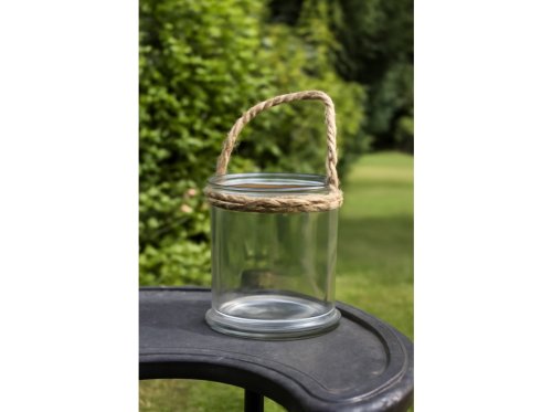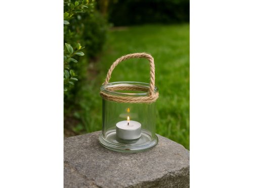 Tato čirá skleněná lampa o rozměrech 125 × 115 mm je vybavena dekorativním závěsem z hrubého přírodního lana. Je ideální k zavěšení do interiéru i exteriéru – například na pergolu, háček nebo větev. Po vložení svíčky vytvoří krásné, jemné světlo a rustikální atmosféru.