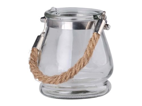 Kompaktní lampa z čirého skla o velikosti 95 × 90 mm se závěsem z přírodního lana je ideální pro zavěšení na menší prostor. Hodí se pro čajové svíčky, které v ní vytvářejí jemné a útulné osvětlení. Skvělá jako drobný doplněk do interiéru, na slavnosti nebo letní večery.