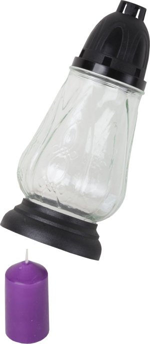 Skleněné chránítko na svíčku určené jako ochrana svíčky před povětrnostními vlivy. Spodní část a víčko jsou vyrobeny z plastu. Určeno především na hřbitovy.