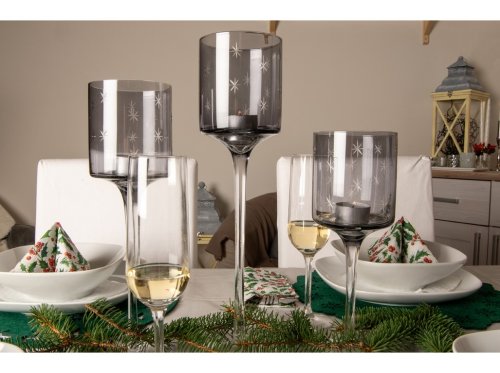 Sada tří skleněných svícnů o rozměrech 90 × 250, 90 × 300 a 90 × 350 mm na nožičkách. Kouřové sklo dodává moderní a sofistikovaný vzhled. Svícny jsou vhodné pro kónické svíčky nebo čajové svíčky a vytvářejí příjemnou a hřejivou atmosféru v interiéru.