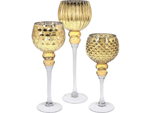 Sada tří skleněných svícnů na nožičkách v zlatém provedení poskytuje bezpečné a stabilní umístění svíček. Zlaté sklo dodává interiéru slavnostní a elegantní vzhled. Svícny jsou vhodné pro stolní aranžmá, parapet nebo samostatnou dekoraci, ideální pro vánoční nebo slavnostní atmosféru.