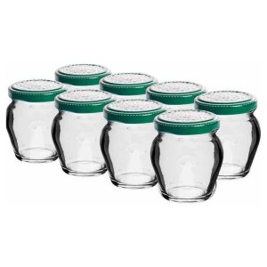 Sklenice s barevným víčkem - mix barev, víčko součástí balení. objem: 106 ml balení: 8 ks Ideální pro skladování potravin.