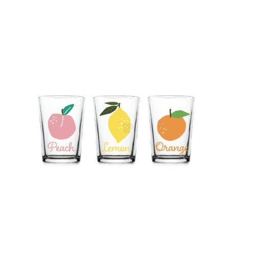 sklenice na pití, 300 ml/10,2 oz. sada 3ks. průměr horní části 79xh125mm. 1 design na sadu, 3 různé designy letního ovoce (broskev/pomeranč/citron)/ 280x80x130mm3 x ks sklenice 300ml, sklo, 79x79x125mm