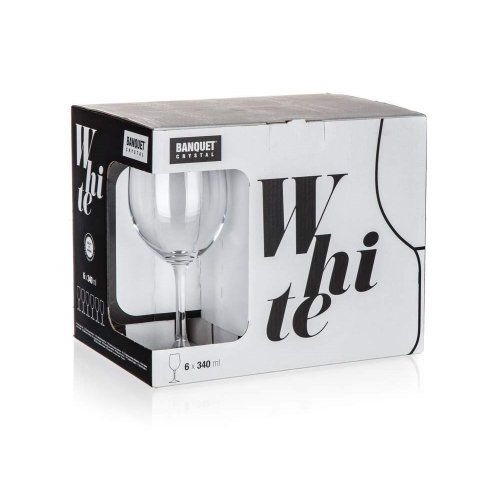 Sada sklenic značky BANQUET CRYSTAL na bílé víno v ozdobném obalu Sklenice jsou vyrobeny z velmi kvalitního skla české výroby Objem: 340 ml Sada obsahuje 6 kusů Sklenice je možné mýt v myčce