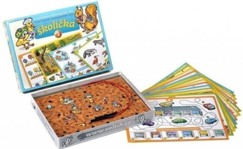 Školička 3. Elektronické testovací tabulky jsou určeny k osvojování a testování předškolních a školních znalostí hravou formou. Správnou odpověď na otázku signalizuje rozsvícené zelené světélko elektronického obvodu. Po výběru otázky dítě zvolí odpověď a její správnost si ověří tak, že se dotkne jedním testovacím kolíkem kontaktní plošky u otázky a druhým kolíkem plošky u odpovědi. Pokud je odpověď správná, rozsvítí se zelené světélko. V opačném případě, zůstane světélko zhasnuto. V krabici 22x16x3 cm. Vhodné pro děti od 4 let.