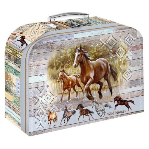Papírový dětský kufřík velikosti 35cm Wild horses.<br> • je vyroben z kvalitního pevného kartonu s vnitřní potiskem a kovovým uzavíráním s rukojetí <br> • je vhodný na školní potřeby, výtvarné potřeby, do kterého vejde i blok barevných papírů A4 <br> • jeho využití v dětském světě je velké, možnost uložení hraček ale i jiných drobností na cestu k babičce