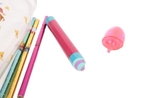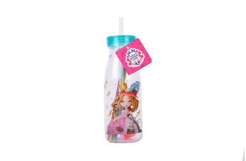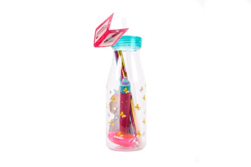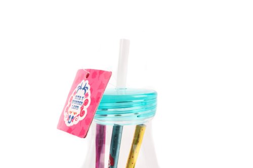 Školní sada v lahvičce s brčkem. Obsahuje ořezávátko, tři tužky a gumu. Vyrobeno z nezávadného plastu – lahvičku s brčkem lze po vymytí použít na pití.