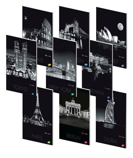 Působivé černobílé fotografie světových metropolí tvoří kolekci obalů kvalitních sešitů nejen pro studenty. Matnou pevnou obálku doplňují leskem zvýrazněné detaily. Formát A4, 40 listů (papír 80 g), linkovaný. Celkem 9 různých motivů.