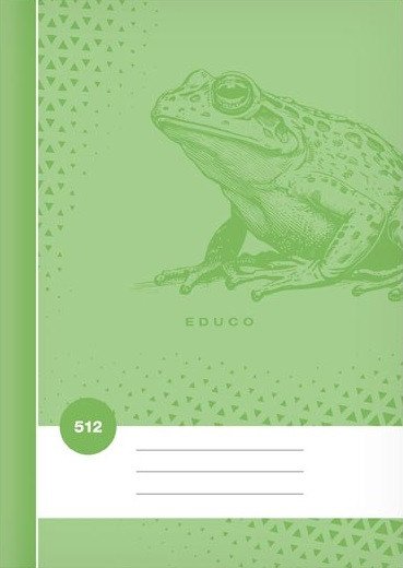 Školní linkovaný sešit ve formátu A5, v zelené barvě, s motivem žáby, v deskách z křídového papíru. Sešit je určený především pro prvňáčky, kteří se začínají učit psát. Stránky jsou bez okrajů. <br> <br> Typ: 512 <br> Formát: A5 <br> Motiv: žába <br> Barva: zelená <br> Šířka řádku: 16 mm <br> Gramáž papíru: 60 g <br> Počet listů: 10, linkované <br> Desky: matný křídový papír 200 g