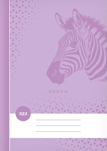 Školní linkovaný sešit ve formátu A5, ve fialové barvě, s motivem zebry, v deskách z křídového papíru. Stránky jsou bez okrajů. <br> <br> Typ: 523 <br> Motiv: zebra <br> Barva: fialová <br> Šířka řádku: 12 mm <br> Počet listů: 20, linkované <br> Gramáž listů papíru: 60 g <br> Desky: matný křídový papír 200 g