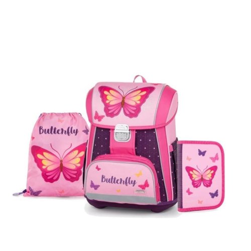 Aktovka: Školní aktovka z řady Premium je anatomicky tvarovaná a zajišťuje tak správné usazení na zádech. Vyztužená záda a vnitřní výztuha udržují stálý tvar batohu. Polstrování je z příjemného prodyšného materiálu, široké měkčené popruhy jsou navrženy tak, aby dokonale přilnuly a rovnoměrně zatížily ramena dítěte. Aktovka se skládá z jedné prostorné komory, kam se pohodlně vejdou všechny školní pomůcky pro děti v 1. a ve 2. třídě. Dno batohu je z pevného materiálu, chrání tím obsah před převržením a vysypáním. Zapínání je na bezpečnostní přezku. Přední kapsička je určena na svačinu, nechybí řada reflexních prvků, díky kterým je aktovka viditelnější. Objem: 28 l. Nosnost: 8 kg. Sáček: Školní sáček na cvičky vyrobený z kvalitního materiálu. Sáček se uzavírá stažením šňůrek. Vhodný jak do školy, tak na sport a další volnočasové aktivity dětí. Penál: Jednopatrový školní penál se dvěma chlopněmi bez náplně. Gumová poutka k uchycení psacích potřeb. Na vnitřní chlopni je průhledná fólie pro rozvrh hodin.