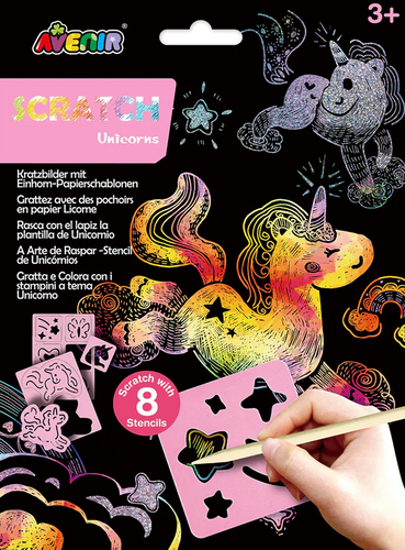 Skvělá řemeslná sada pro malé děti. Tato zábavná sada kombinuje kresbu škrábáním a šablony. Pomocí 8 šablon s mnoha různými obrázky vytvořte kouzelné obrázky. Věk: 3+