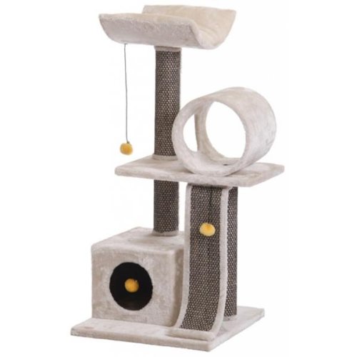 Pohodlný strom na škrábání s pelíškem a polstrovanou vyhlídkou. Kočky musí mít možnost k broušení svých drápků. Ve volné přírodě jim k tomu nejlépe slouží stromy a jejich kůra. V bytě jim pak musíte vy nabídnout tu pravou a vhodnou alternativu. Jinak si malý nezbeda najde náhradu například ve vašem nábytku, křesle nebo koberci. Plošiny na ležení jsou kompletně potaženy plyšem, horní vyhlídka je polstrovaná, škrabadlo je vyvedeno v elegantní krémové barvě a obsahuje plyšové žluté kuličky s rolničkami na hraní. Parametry:
