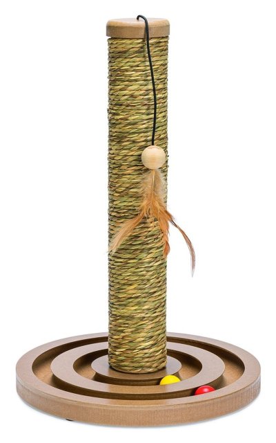 Škrabadlo od Karlie pro hravé kočky. Dřevěná základna s integrovanou koulodráhou. Dřevěné koule lze rozpohybovat a lovit. A jako bonus vzrušující hračka ze dřeva a peří. Škrabací sloupek s mořskou trávou pro péči o drápy.