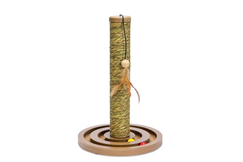 Škrabadlo Brigitte je skvělý kus škrabacího nábytku pro hravé kočky. Do dřevěné základní desky jsou zakomponovány dvě kuličkové dráhy, ve kterých se kočka může pohybovat a pronásledovat dvě barevné dřevěné kuličky.