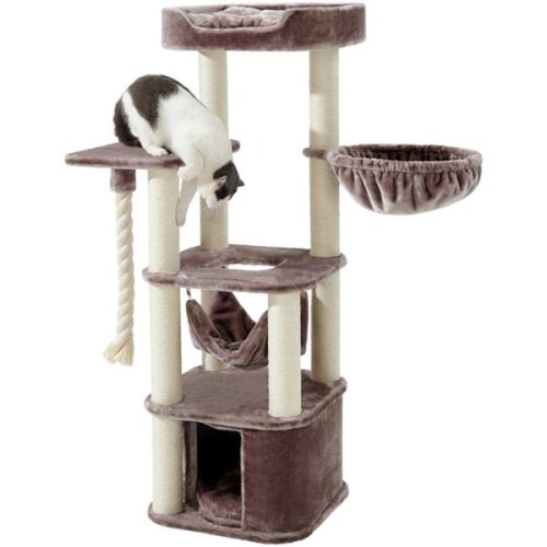 Škrabadlo pro kočky nabízí všestranné využití. Kočky musí mít možnost k broušení svých drápků. Ve volné přírodě jim k tomu nejlépe slouží stromy a jejich kůra. V bytě jim pak musíte vy nabídnout tu pravou a vhodnou alternativu. Jinak si malý nezbeda najde náhradu například ve vašem nábytku, křesle nebo koberci. Škrabadlo je vyvedené v elegantní krémové barvě s robustní konstrukcí. Obsahuje kmeny se sisalem, lenošku, měkký domeček, kvalitní provaz, závěsnou hamaku a horní odpočívadlo s polštářkem. Parametry:
