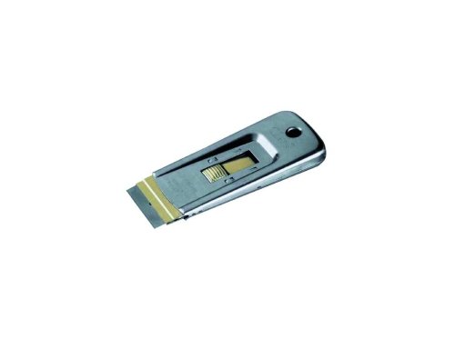 Kovová škrabka na sklo má kovové tělo a mosazný posuvný jezdec sloužící k vysouvání/zasouvání čepele.