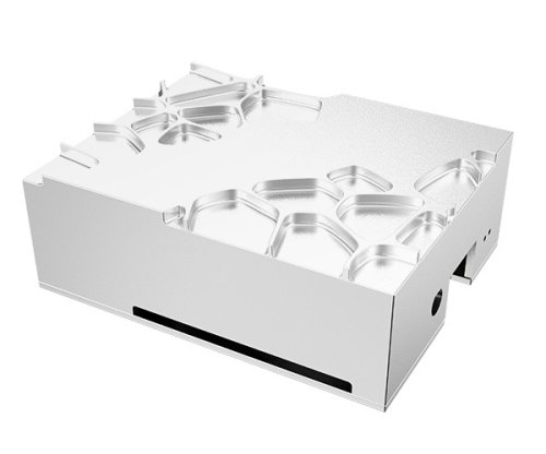 Stříbrné pouzdro s výrazným drahokamovým designem nahoře. Zahrnutá tepelná souprava ochlazuje Raspberry Pi 4. Plná podpora otevření I / O.