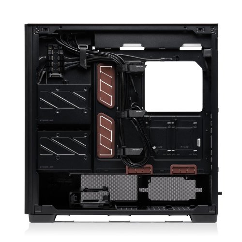 Skříň nabízí enormní vnitřní prostor s podporou pro základní desky formátu E-ATX a monstrózní grafické karty s délkou až 455 mm. Pro nadšence do vodního chlazení je připravena podpora pro 420mm radiátory v přední části a 360mm radiátory nahoře, přičemž vestavěný digitální i-view displej umožňuje v reálném čase sledovat teplotu CPU a GPU. Konstrukce dále zahrnuje magnetické prachové filtry na všech klíčových vstupech a pokročilý cable management s hloubkou 33 mm, což zajišťuje nejen nízké teploty, ale i dokonale čistý interiér bez víření prachu.