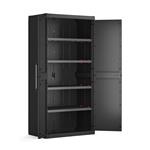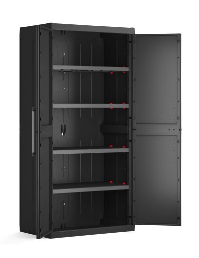 Skříň obsahuje celkem 4 přídavné police - každá s výraznou nosností až 25 kg, které přijdou vhod pro výrazně těžší předměty všeho druhu. Lze ji tedy využít pro skladování dílenského nářadí či zahradnických potřeb, kdy přijde vhod pro uložení náčiní s dlouhou násadou, které by se jinam nevešlo. Díky svému provedení v neutrální černé barvě zapadne do každého prostoru bez ohledu na jeho konceptuální styl.