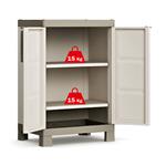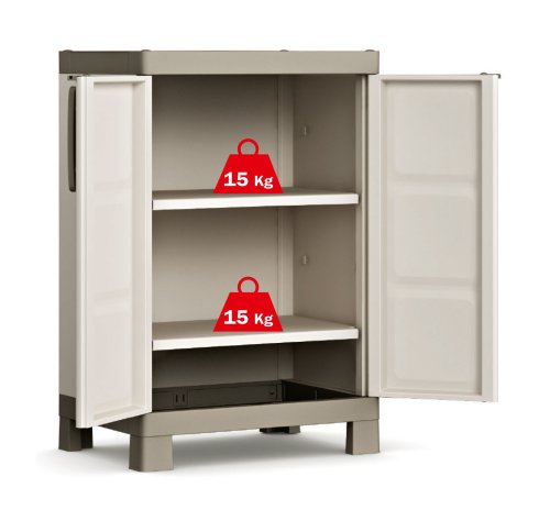 Skříň obsahuje celkem 2 přídavné police - každá s výraznou nosností až 25 kg, které přijdou vhod pro výrazně těžší předměty všeho druhu. Lze ji tedy využít pro skladování dílenského nářadí či zahradnických potřeb, kdy přijde vhod pro uložení náčiní s dlouhou násadou, které by se jinam nevešlo. Díky svému provedení v univerzální béžové barvě zapadne do každého prostoru bez ohledu na jeho konceptuální styl.