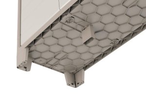 Součástí skříně je systém Assisted Opening System (AOS) s kovovými panty, který zaručuje plynulé otevírání a pevné zavření dveří. Dveře můžete navíc uzamknout visacím zámkem díky připraveným očkům, což zvyšuje bezpečnost uloženého obsahu. Stabilitu celé konstrukce podporuje pátá výškově nastavitelná noha.