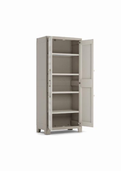 Vnitřní prostor nabízí čtyři nastavitelné police, z nichž každá unese až 30 kg. Spodní část skříně má rovněž nosnost 30 kg, což vytváří celkovou nosnost až 150 kg. Díky variabilnímu uspořádání snadno přizpůsobíte vnitřní prostor vašim potřebám – od uložení drobných předmětů až po větší krabice nebo kanystry.