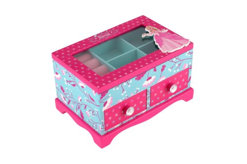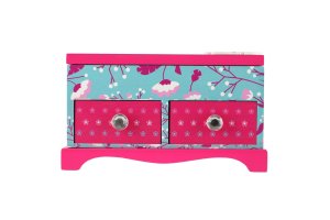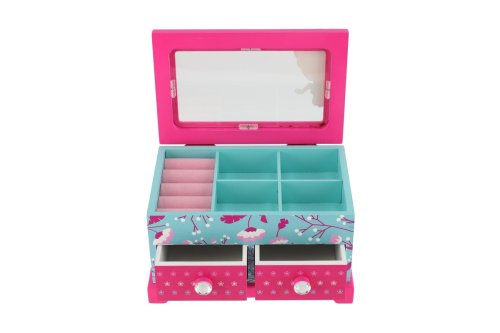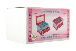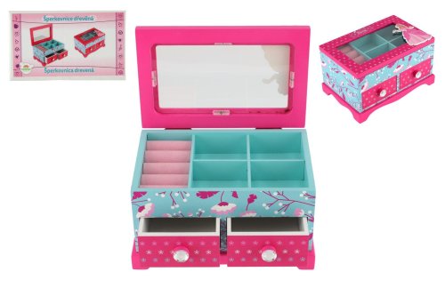 Šperkovnice bude ideálním místem pro uložení pokladů každé dívky. Je vyrobena ze dřeva a má skleněné víko. Šperkovnice má modrou barvu a je pomalována krásným motivem kytiček. Odklípěcí víko je růžové, má na sobě kytičky a princeznu. Tato barevná kombinace bude ideální doplněk pro dětský pokoj. Uvnitř je prostor pro pořádání suvenýrů nebo šperků. Šperkovnice má dvě zásuvky. Rozměr šperkovnice: 18x12,5x12cm Není hračka