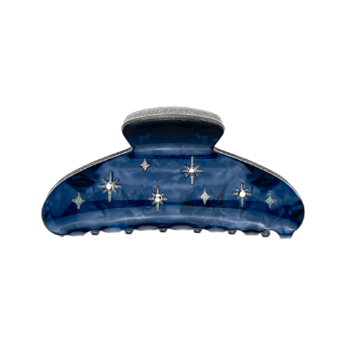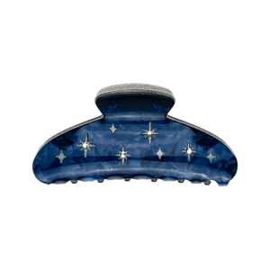 Objevte kouzlo noční oblohy s Eclipse Nightfall z kolekce Eclipse. Tento nádherný klip je zdoben třpytivými kamínky připomínajícími jasné hvězdy, zatímco vnitřní strana je decentně pokrytá stříbrnými třpytkami – vytváří tak krásný kontrast mezi světlem a tmou. Perfektní pro dodání nebeského lesku vašemu účesu – klip Nightfall promění každý look v elegantní poctu tajemstvím noci.